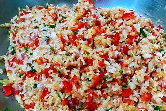 1.茄子三個將其去皮然後用擦絲器擦成細絲,放入1勺精鹽將其攪拌均勻。豬肉500克將其剁成肉末,放入精鹽、十三香、生抽、老抽、蔥、薑、食用油調味。