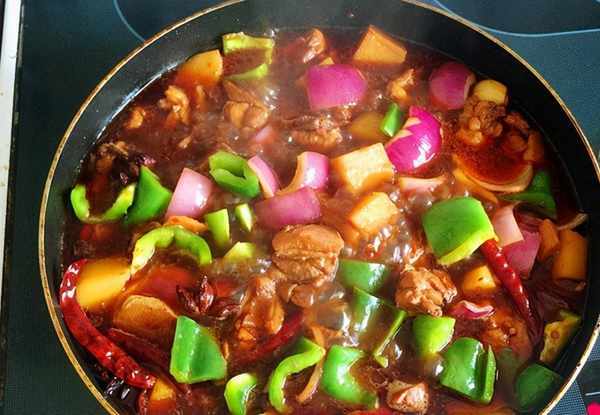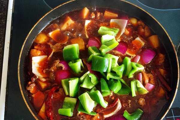 11、時間到瞭打開鍋蓋將洋蔥塊還有青椒塊放入鍋中,煮至湯汁收幹就可以瞭。