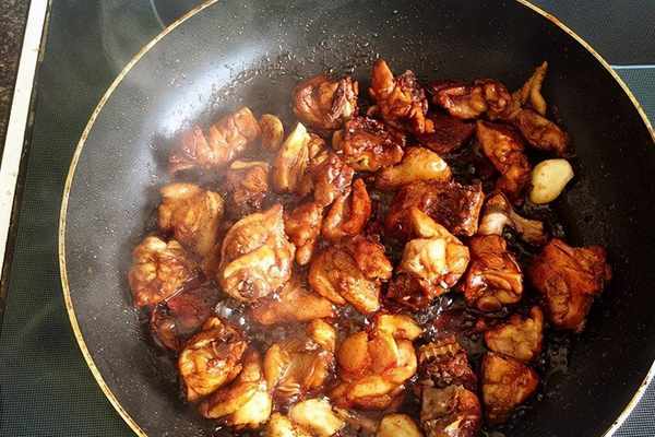 8、將焯好的雞塊放入鍋中煸炒上色,加入蒜片還要生薑片,翻炒到雞塊均勻上色瞭就可以看瞭。