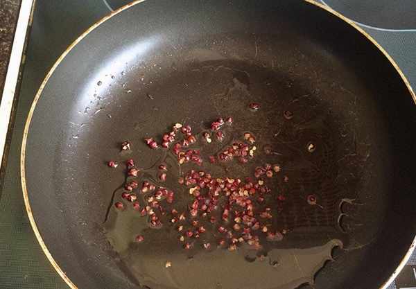6、鍋中加入適量的食用油燒熱,然後將花椒放入鍋中煸炒出香味,然後再將炒香之後的花椒撈出來棄用。