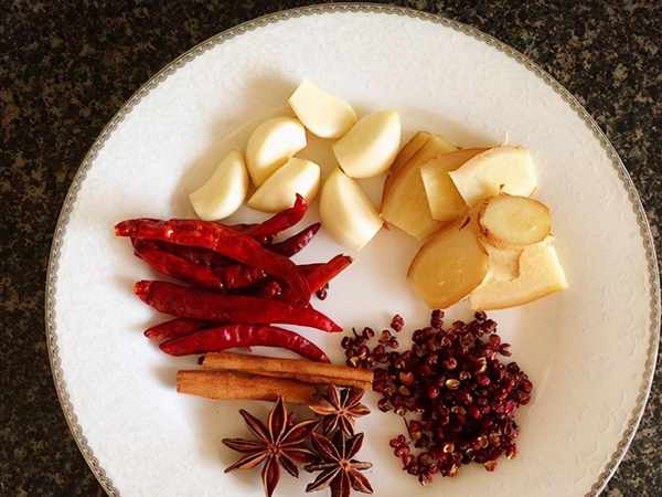 3、再準備好所有的調味料,八角、幹辣椒還有大蒜和生薑以及花椒。