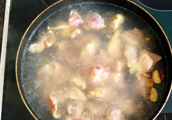 4、鍋中添加半鍋的清水,然後將剁好的雞塊冷水下鍋焯一下,時間不用太長,大約是一分鐘,將雞肉裡面的血水和雜質焯出來就可以瞭。