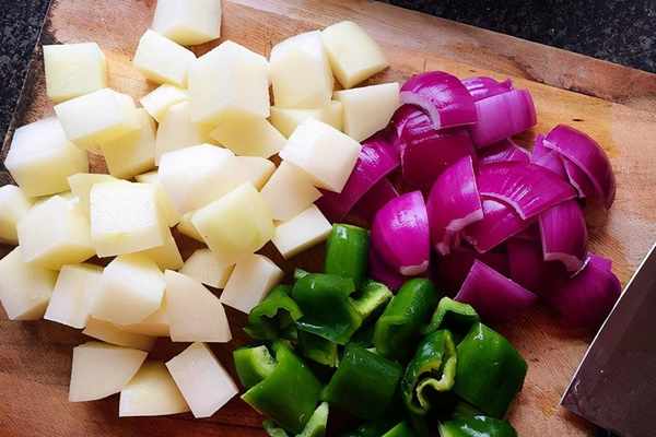 1、首先準備好這道菜要用的全部食材,將土豆削皮之後切成小塊,然後將洋蔥剝皮之後切成小塊,再將青椒洗幹凈去電根部和青椒籽切成小塊備用。