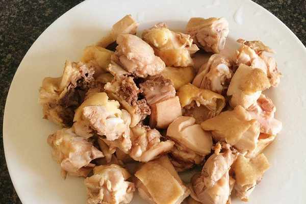 5、焯好的雞塊撈出來瀝幹水分裝入盤中備用。