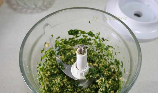 把羅勒葉、大蒜和鹽放進料理機中,啟動機器,先把羅勒葉打碎。