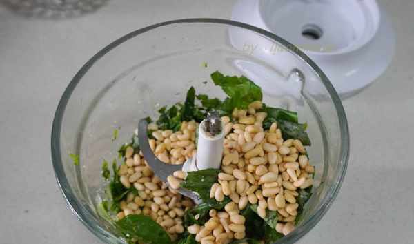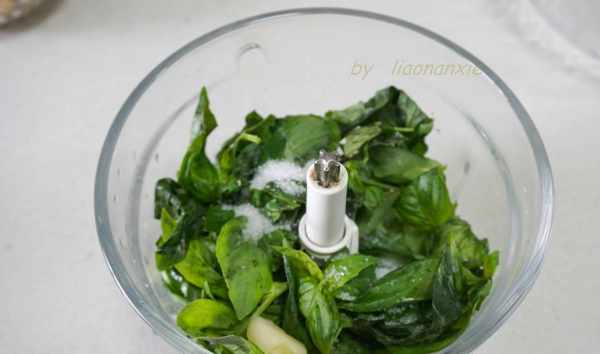 青醬材料:羅勒鮮葉50克,松子50克,帕瑪森奶酪20克,大蒜兩瓣,橄欖油約100克,鹽5克。
