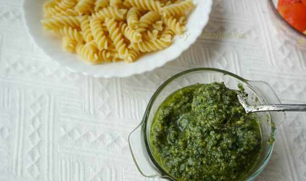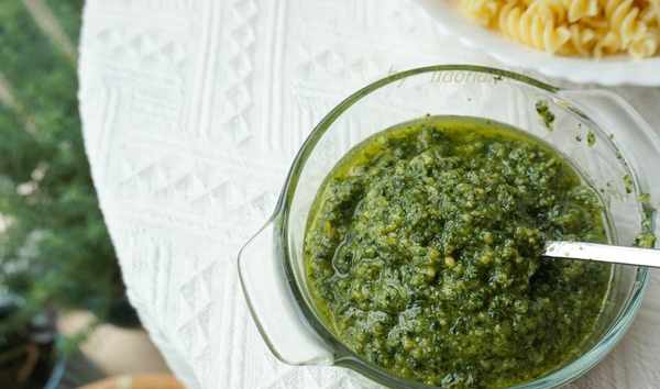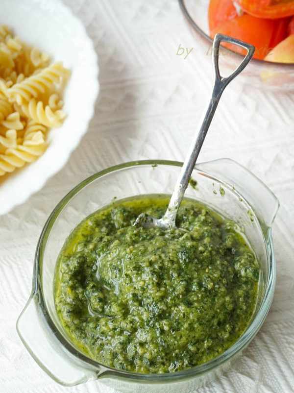 倒出打好的青醬,直接搭配煮好的面條就可以上桌瞭。青醬宜現做現吃,如果一次做多瞭一餐沒有吃完,可以加一些橄欖油封面,下一頓還可以吃。不宜久放。