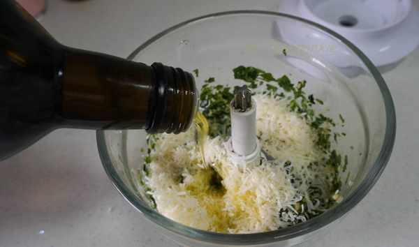 把奶酪碎放進料理機,加入橄欖油,再次啟動料理機,充分攪打均勻就好瞭。