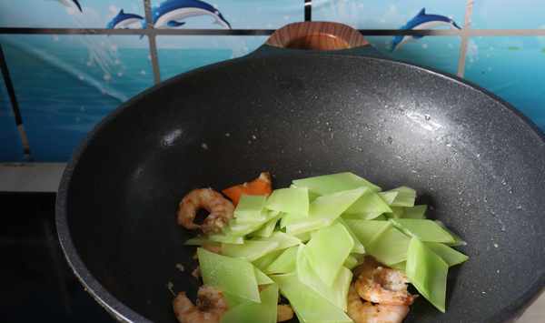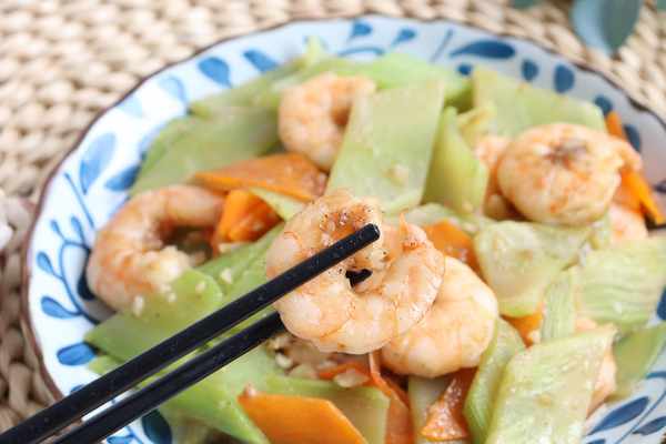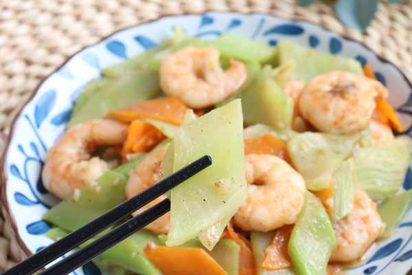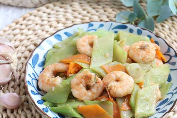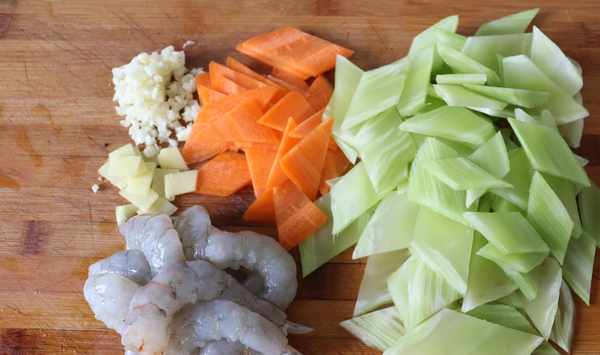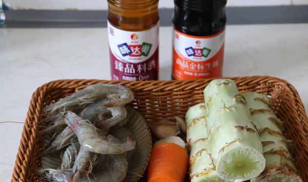 具體制作步驟:準備好所需要的食材並清洗幹凈萵筍,胡蘿卜去皮後切菱形片,蒜切末,薑切片,大蝦挑蝦線剝蝦殼備用