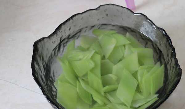 鍋中水燒開,放入少許食用油和鹽,放入萵筍片焯水3分鐘撈出,過涼水後撈出控幹備用