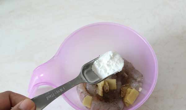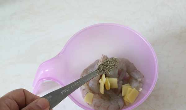 大蝦中放入半大勺料酒,1小勺黑胡椒粉,1小勺食鹽,半大勺淀粉,抓勻醃制10分鐘左右
