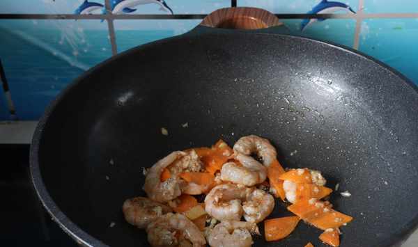 熱鍋涼油,放入蒜末煸炒香,放入胡蘿卜炒熟,再放入蝦仁煸炒變色