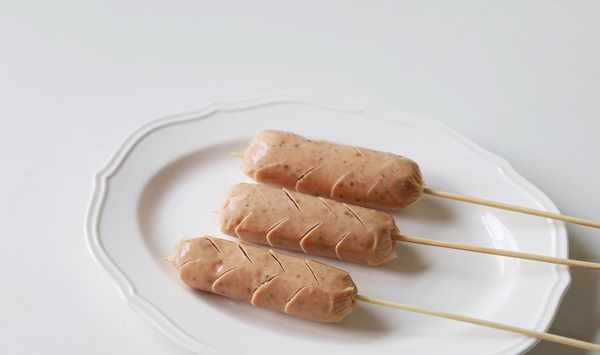 做法1.在烤腸兩側分別斜45度打上花刀,切的稍稍深一些,香腸會開花更大更酥脆,打好花刀的烤腸插上竹簽備用。