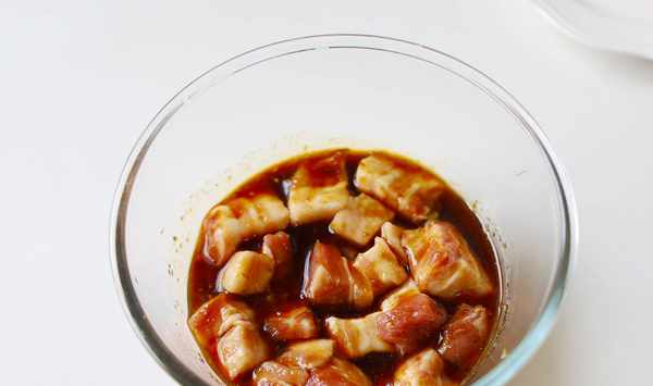 2.把五花肉清洗幹凈切成小塊,用燒烤醬汁醃制半個小時以上。在這兒要提醒大傢一下,撒上醬料之後一定要用手抓勻