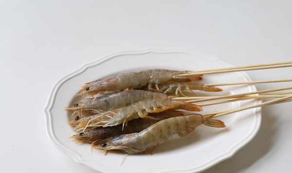 4.將蝦剪去蝦須,挑去蝦腸,清洗幹凈。加入料酒、黑胡椒粉、海鹽醃制30分鐘左右。竹簽從蝦尾串進去,直到蝦頭部,把所有的蝦都串好。