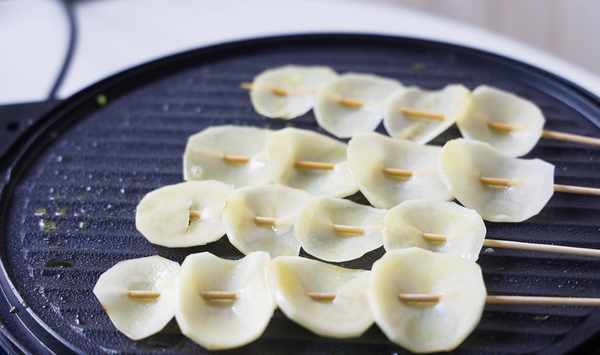 6.土豆片切得比較薄,要記得電餅鐺熱瞭在刷油再烤,防止粘連