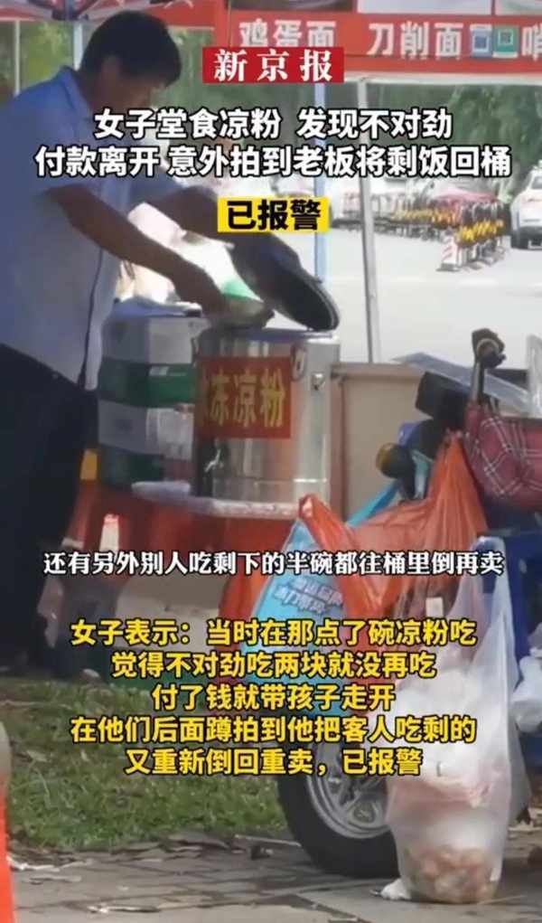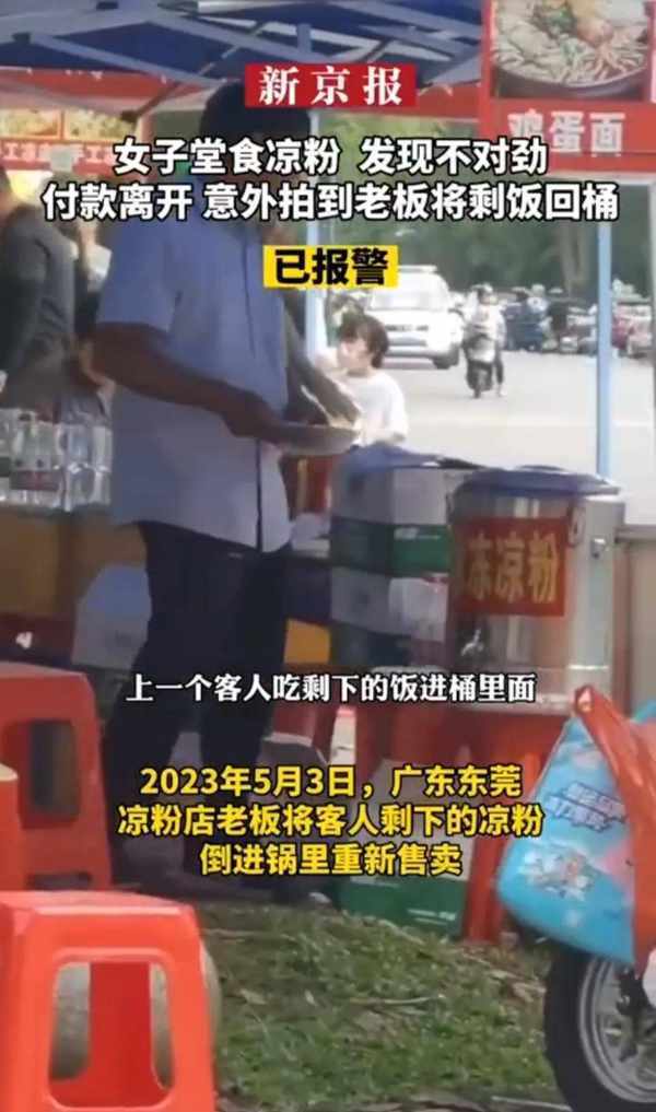 5有3日,在廣東東莞,這位女子在一傢小攤上點瞭一碗涼粉,但是吃瞭兩塊後就感覺味道不對勁瞭,於是她停止瞭進食,付瞭錢便帶著孩子離開瞭。然而,當她走出小攤不遠,卻發現攤主正把她吃剩的涼粉重新倒回去,準備繼續賣給下一位顧客。這讓她非常震驚和氣憤,於是她立刻報警,事情還在處理中。
