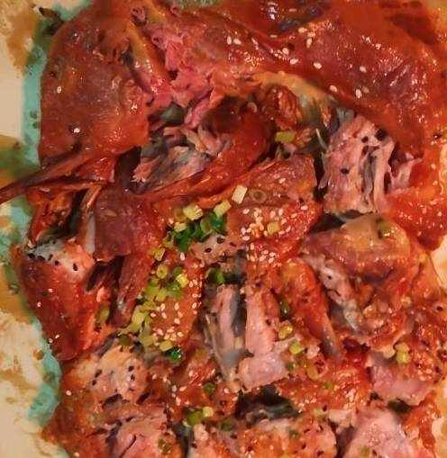鐵板加熱後刷香料油或花生油加熱後放入撕好烤鴨,烤制表皮略焦出香味後(一般15秒左右)根據顧客口味撒入圓蔥末、洋蔥末、孜然粉、辣椒粉,燒烤撒料等重新壓制烤出香味即可。