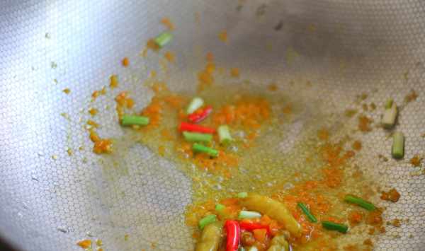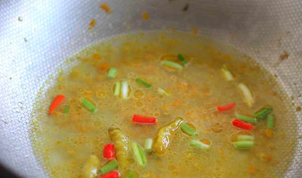 2.熱鍋倒油燒熱,倒入野山椒、朝天椒、蔥末、黃辣椒醬炒香