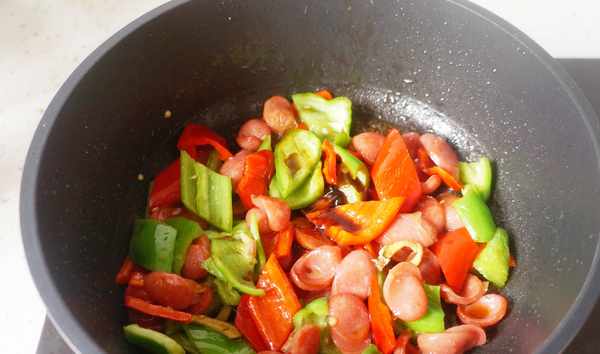倒入青椒片繼續翻炒1分鐘,加入1勺生抽,1勺蠔油,半勺白糖翻炒均勻。就可以關火瞭。香腸,生抽,蠔油都有咸味,因此我沒再放食鹽。口重的可以再放一點點食鹽調味。