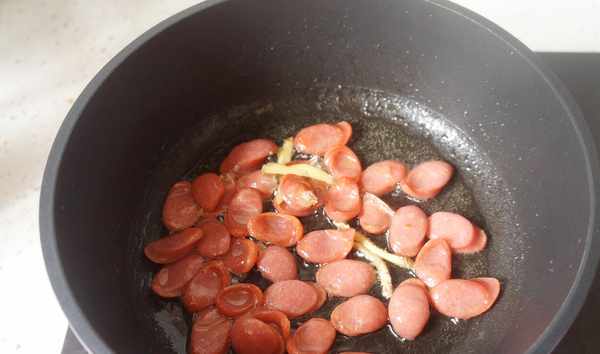 熱鍋熱油,放入火腿腸和薑絲中火煎香。可以少放點油,我不小心倒多瞭一點。