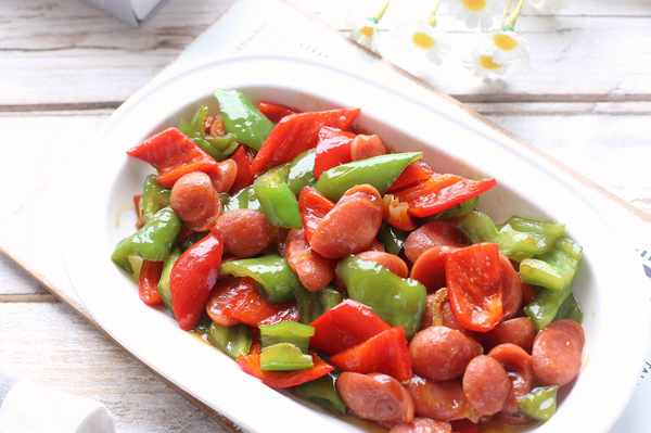 食材:青椒2根,火腿腸3根,生薑1片,生抽1勺,蠔油1勺,白糖半勺
