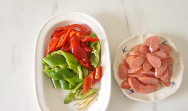 我用的一個綠色青椒,一個紅色青椒,都是不太辣的。傢裡如果隻有一種顏色的也可以。把青椒切斜片,生薑切絲,火腿腸切片備用。
