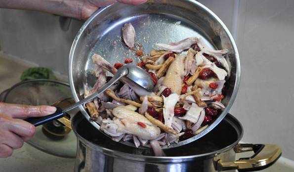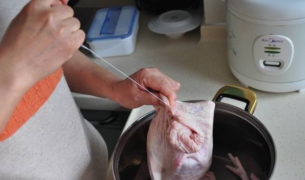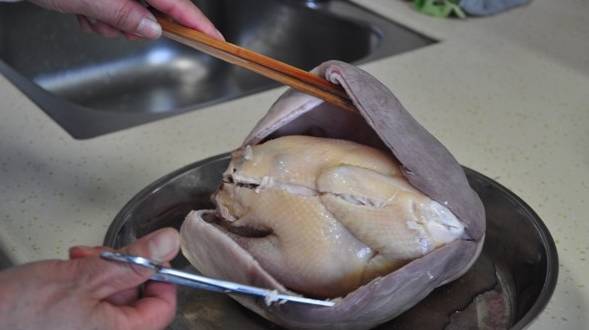 3、把紅棗、黨參、枸杞、胡椒全塞入雞膛內;4、把塞滿材料的雞整隻塞入豬肚裡,然後把豬肚口用線縫上;
