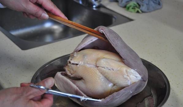 做法:1、豬肚洗凈;2、雞洗凈後將腳及脖子斬掉;