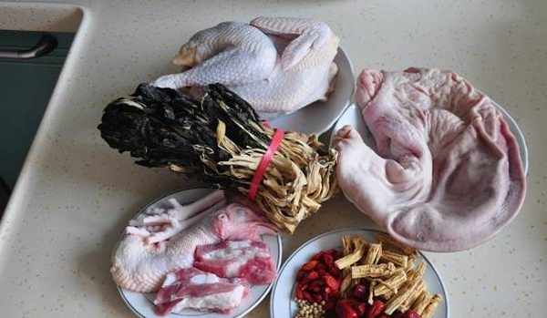 材料:豬肚一個、雞一隻、排骨半條、紅棗、黨參、枸杞、胡椒(壓碎)適量。
