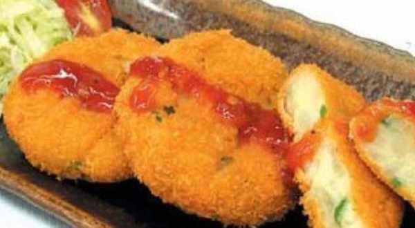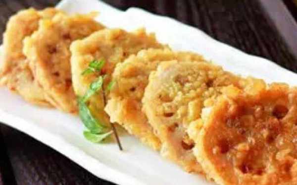 3、打開藕片中間塞入肉餡,均勻地沾上一層面糊,加入油鍋中炸熟後即可食用。