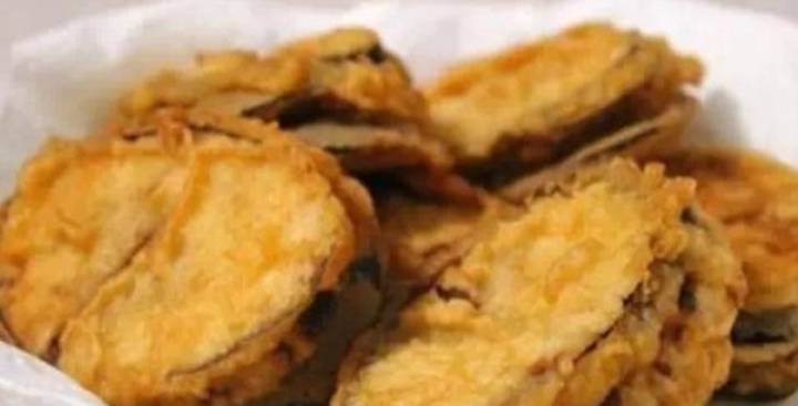4、起鍋燒熱倒多些油,放入茄盒小火炸至表面金黃,用廚房紙巾吸去油脂即可食用。