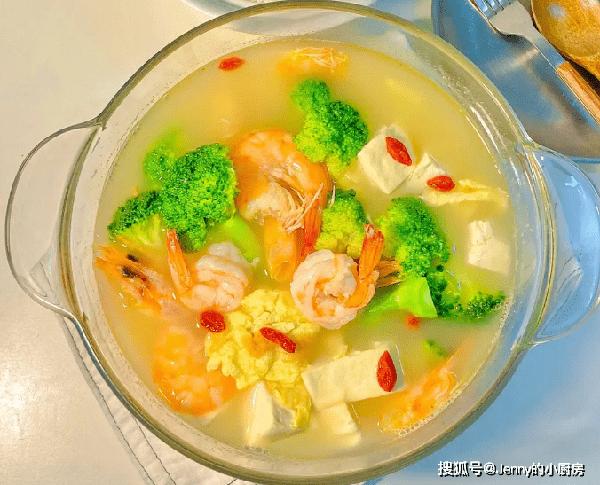 接著放入豆腐塊、雞蛋塊、蝦仁、西藍花,煮到食材斷生。