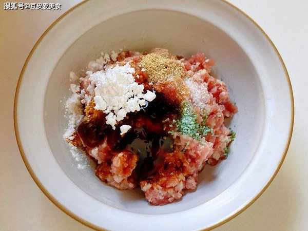 2、接下來我們做肉餡。肉末放入盆裡,加入鹽、蠔油、生抽、胡椒粉、雞精、淀粉,攪拌均勻。