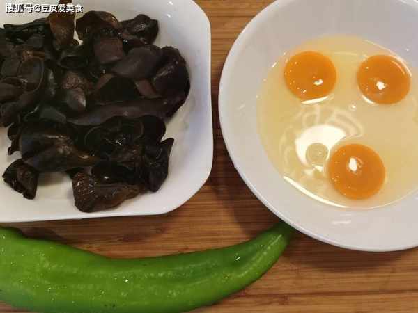 1、木耳提前用清水泡發好。雞蛋打入碗裡,加入少許鹽,再加入少許水,攪拌均勻(加水可以讓雞蛋炒出來更軟嫩可口)。青椒洗凈,切成塊。