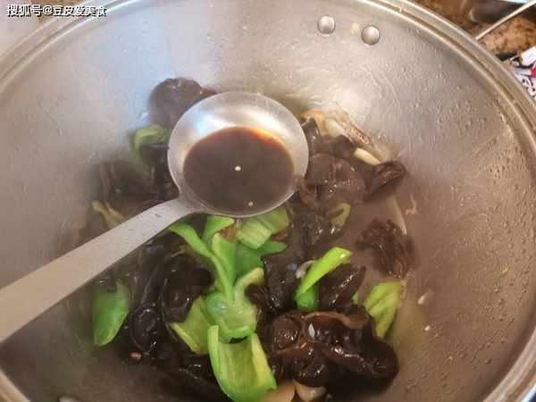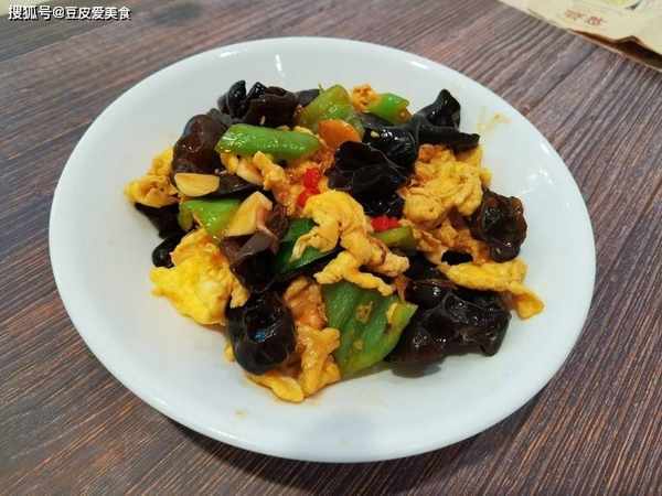 3、鍋裡留底油,下入蔥白和蒜片爆香,下入青椒,翻炒片刻,再下入木耳,快速翻炒均勻。下入生抽,蠔油,翻炒均勻,再下入雞蛋,翻炒均勻,出鍋,完成。