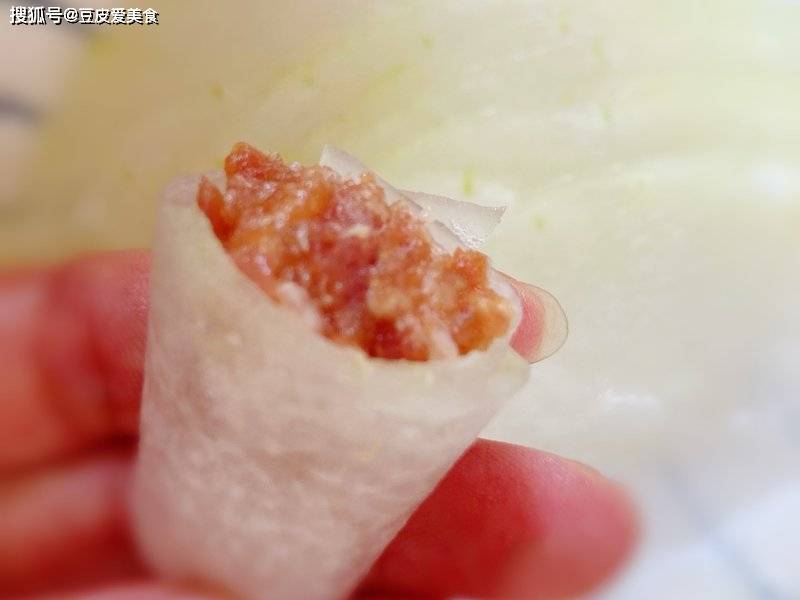 3、冬瓜殺好水後,卷起來,卷成圓椎狀,然後把肉餡從口較大的那邊塞進去,填滿,壓緊實。全部卷好後,擺放在盤裡,擺一圈。