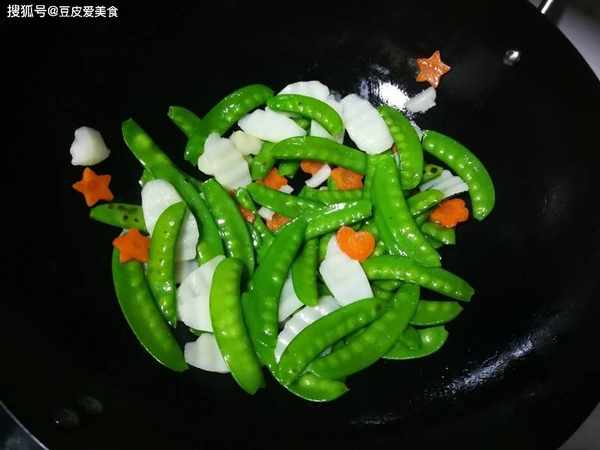 3、起鍋燒油,下入荷蘭豆,山藥和胡蘿卜,翻炒出香味,再倒入料汁,大火快速翻炒均勻,出鍋,完成。