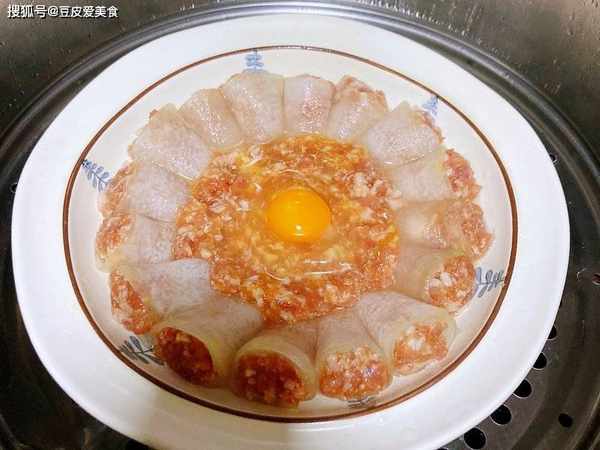 4、把剩餘的肉餡擺在盤子中間,再在上面打上雞蛋,雞蛋喜歡幾個打幾個,看個人意願。然後放入蒸鍋,水開後蒸15分鐘左右。