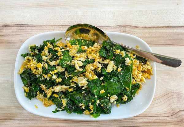 步驟3:起鍋燒油,倒入菠菜雞蛋液,小火慢煎,煎至凝固,然後翻炒均勻,就可以出鍋瞭。