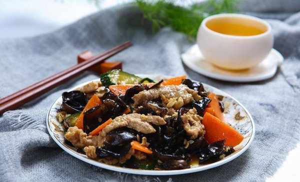 步驟4:起鍋燒油,加入香菇和木耳翻炒片刻,再加肉絲一起翻炒,加些鹽、生抽、老抽和料酒撒些蔥,翻炒均勻。