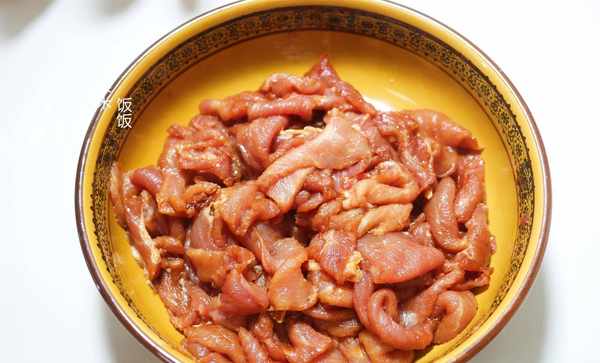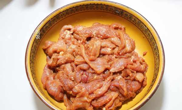 1,豬裡脊肉洗凈,切成薄片。加鹽、少許老抽,抓拌均勻,使肉片上色、入味。