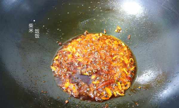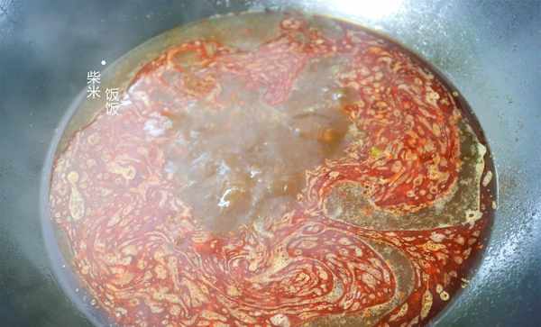 5,加一勺豆瓣醬、一塊火鍋底料,小火炒出紅油。如果喜歡吃辣一點,這裡可以放些幹辣椒一起炒香。