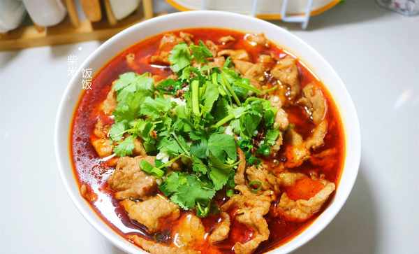 10,最後放些蒜末、蔥花、花椒粒,淋入熱油激發出香味。再撒些香菜點綴一下,水煮肉片就完成瞭。