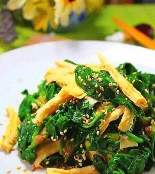 6、菠菜擠幹水,放入鍋中,放入蠔油,起鍋前放入蒸魚豉油後炒勻起鍋即可。