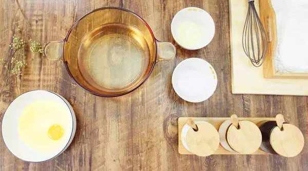 ① 準備1000ml清水,備用。將四個雞蛋打到容器裡,取出三個蛋黃,留一個全蛋。水中加入鹽60g、雞精25g、雞蛋液,攪拌均勻。