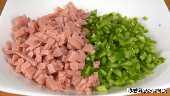 接下來,準備一根胡蘿卜,削去外皮,把胡蘿卜切成薄片,最後切成小碎丁。一個洋蔥對半切開,切成薄片,再切成小碎丁。接下來,準備一根青椒,去掉頭尾,對半切開,去籽後切成條狀,再切成碎丁。一根火腿腸,切成小碎丁。