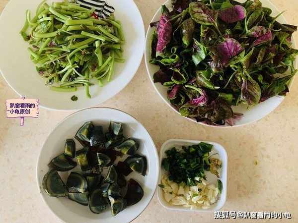 原料:紅葉莧菜1把,皮蛋2個,大蒜4瓣,小蔥1棵,鹽、食用油適量