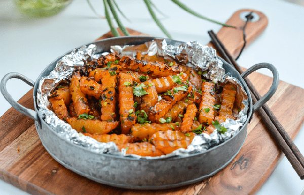 6.將烤制好的狼牙土豆條取出食用即可。可以蘸一些自己喜歡的醬料,例如:甜辣醬、番茄醬、蒜泥醬等。