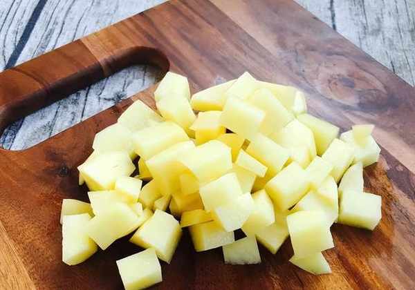 2.將土豆和茄子分別切成小丁,青椒也切成小塊。